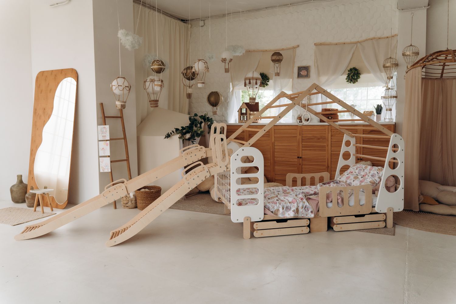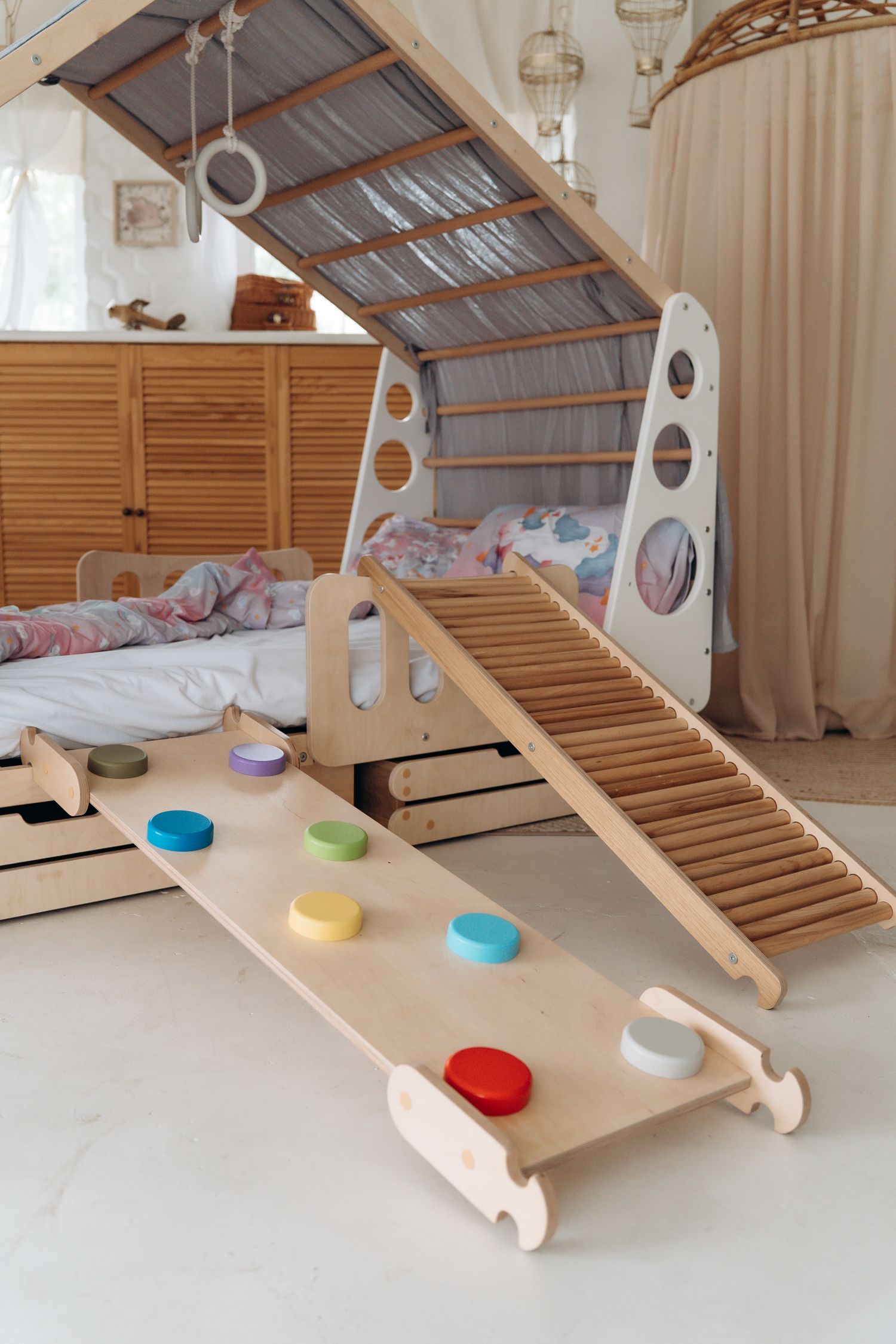 Z zjeżdżalnią, pierścieniami i siatką do wspinania się